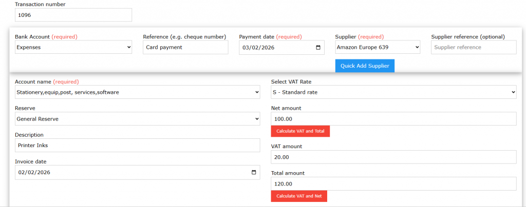 In the Expenses bank account, enter the supplier payment using the VAT receipt.